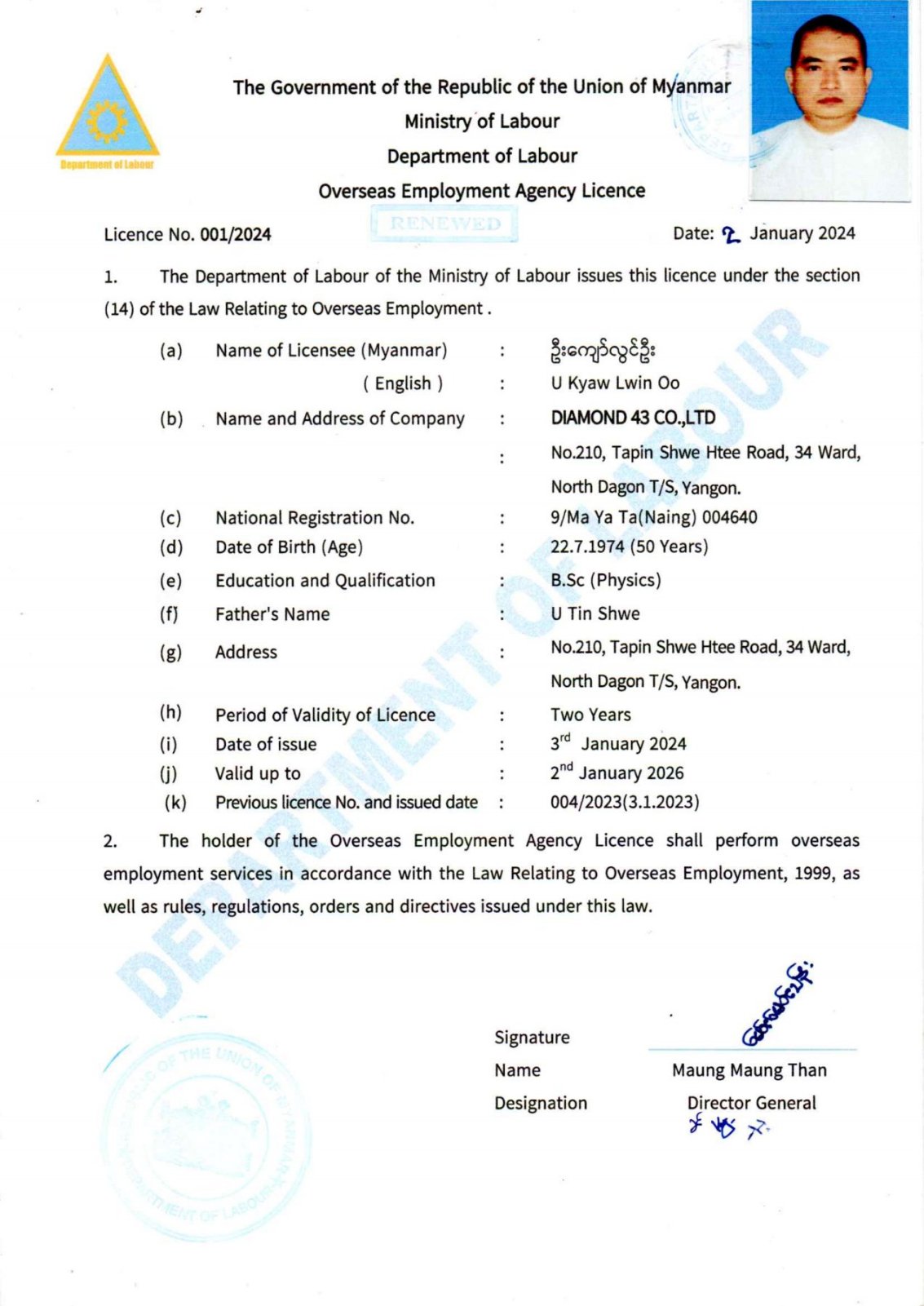We got licence from Department of Labour, Ministry of Labour in 2023. Licence Number is 004/2023.